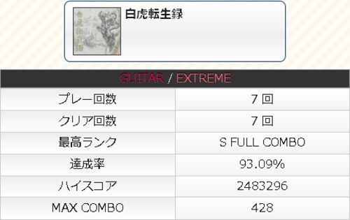 明日からイベントということで、その前のウォーミングアップのつもりでゲーセン行ってきました。 とりあえず、ギターを適当にやっていたんですが、白虎転生録 EXT-G (レベル:8.05) 繋がりました 動画見て、繋がるかもしれないなぁとは思っていたんですが…