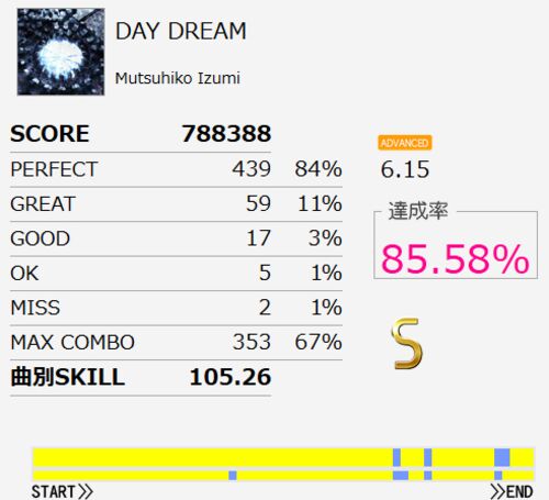 昨日は時間の都合で書けなかったんですが、昨日(水曜)の分の更新です。先ずはドラムでこの曲にリベンジ。DAY DREAM ADV-D (レベル:6.15)やっとS出ましたよ。真ん中が繋がればこのくらいにはなるわけなんですが、リズム取り辛いわ、最後でパフェガタ落…