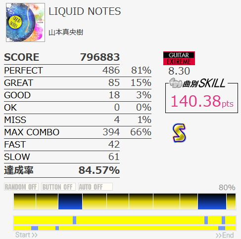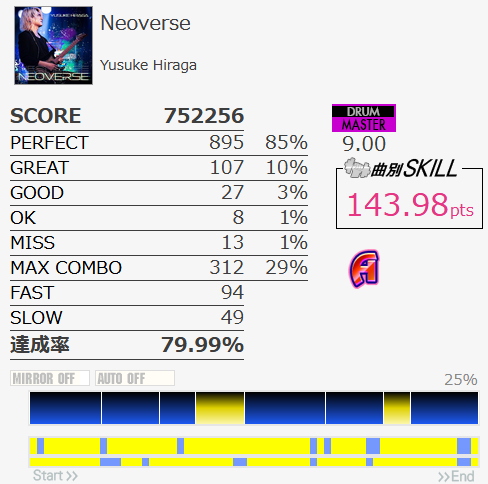 1フレーズ目と2フレーズ目に跨ってミスを誘発するやつが厄介なんですけど、ここが拾えたことは殆ど無いのでそれ以外を全部拾ってもう少しパフェ出るようにしたいものです。